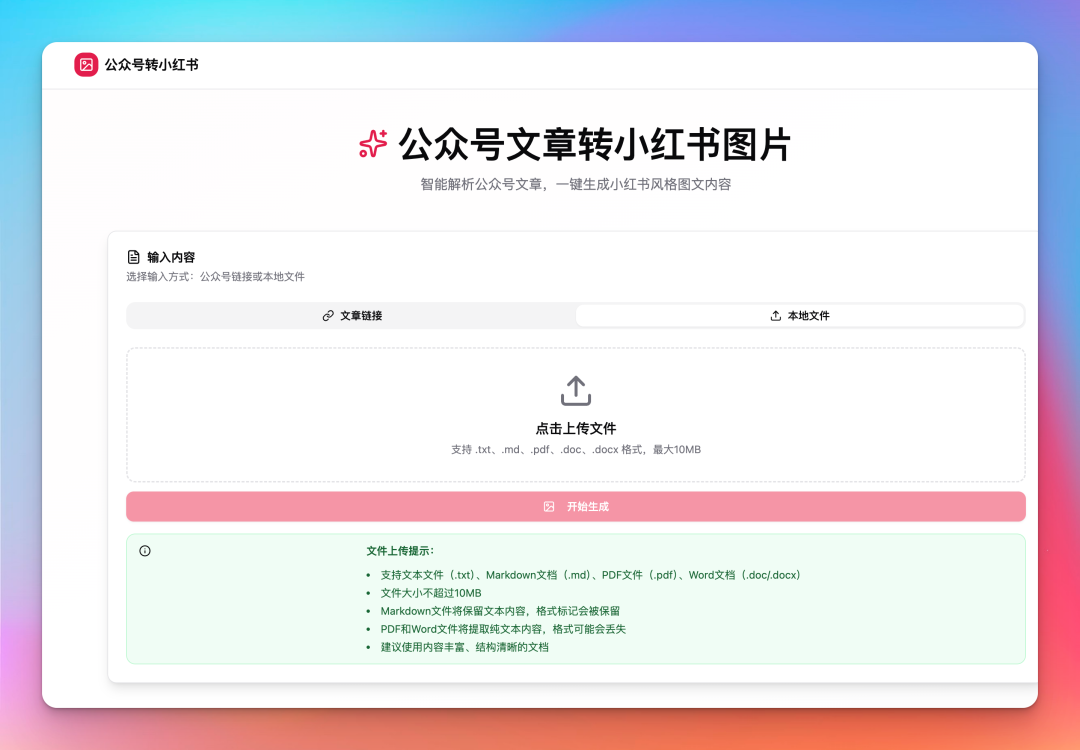 他的功能很简单,输入公众号文章链接或者上传本地文档(支持文本文件(.txt)、Markdown 文档(.md)、PDF 文件(.pdf)、Word 文档(.doc/.docx)),就能生成精美排版的小红书图片(包含封面图和内容图)。