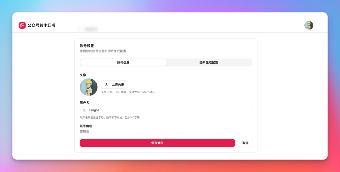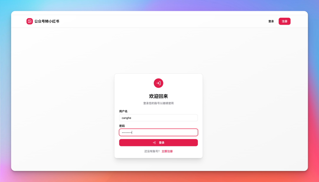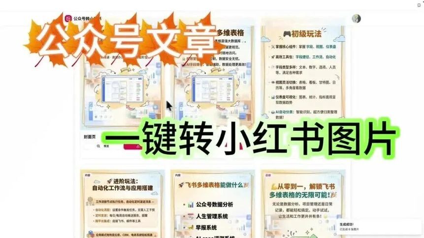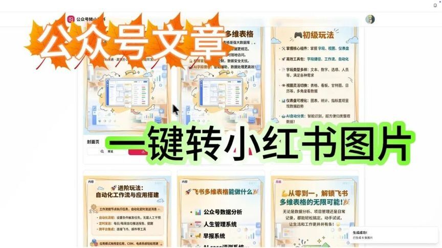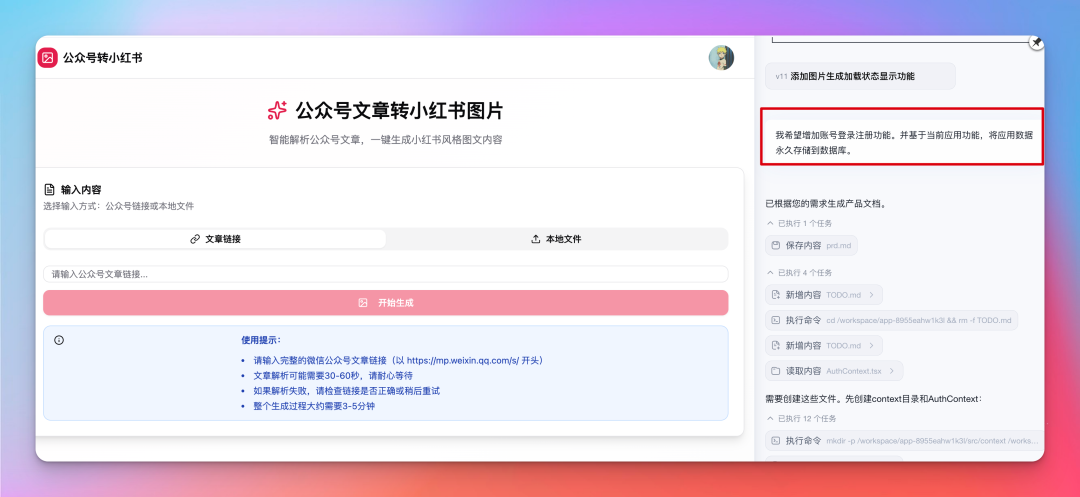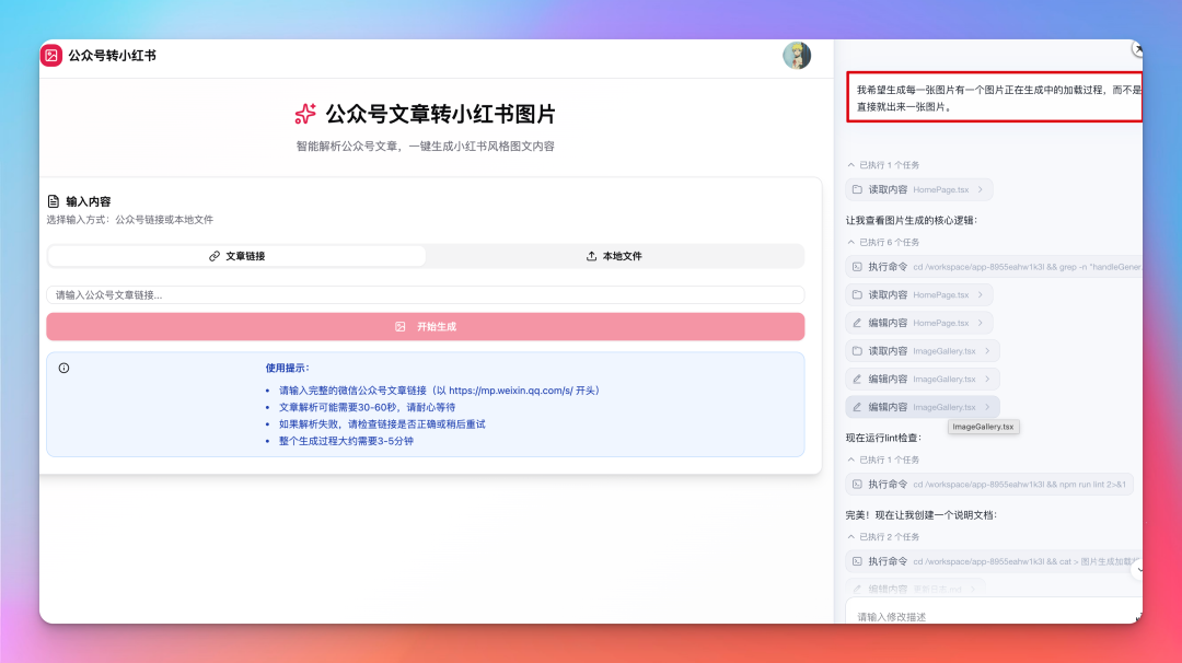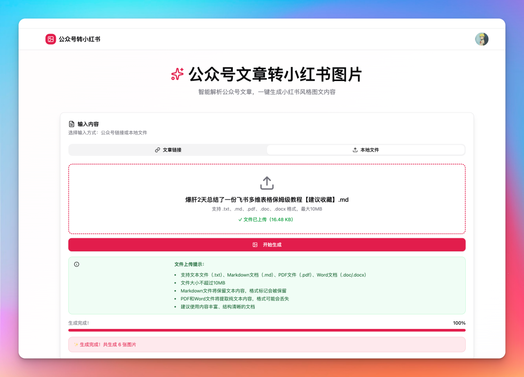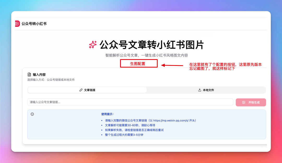我希望产品本身提供原子化的能力足够简单,输入公众号链接或者导入文件,一键生成小红书风格的图片。