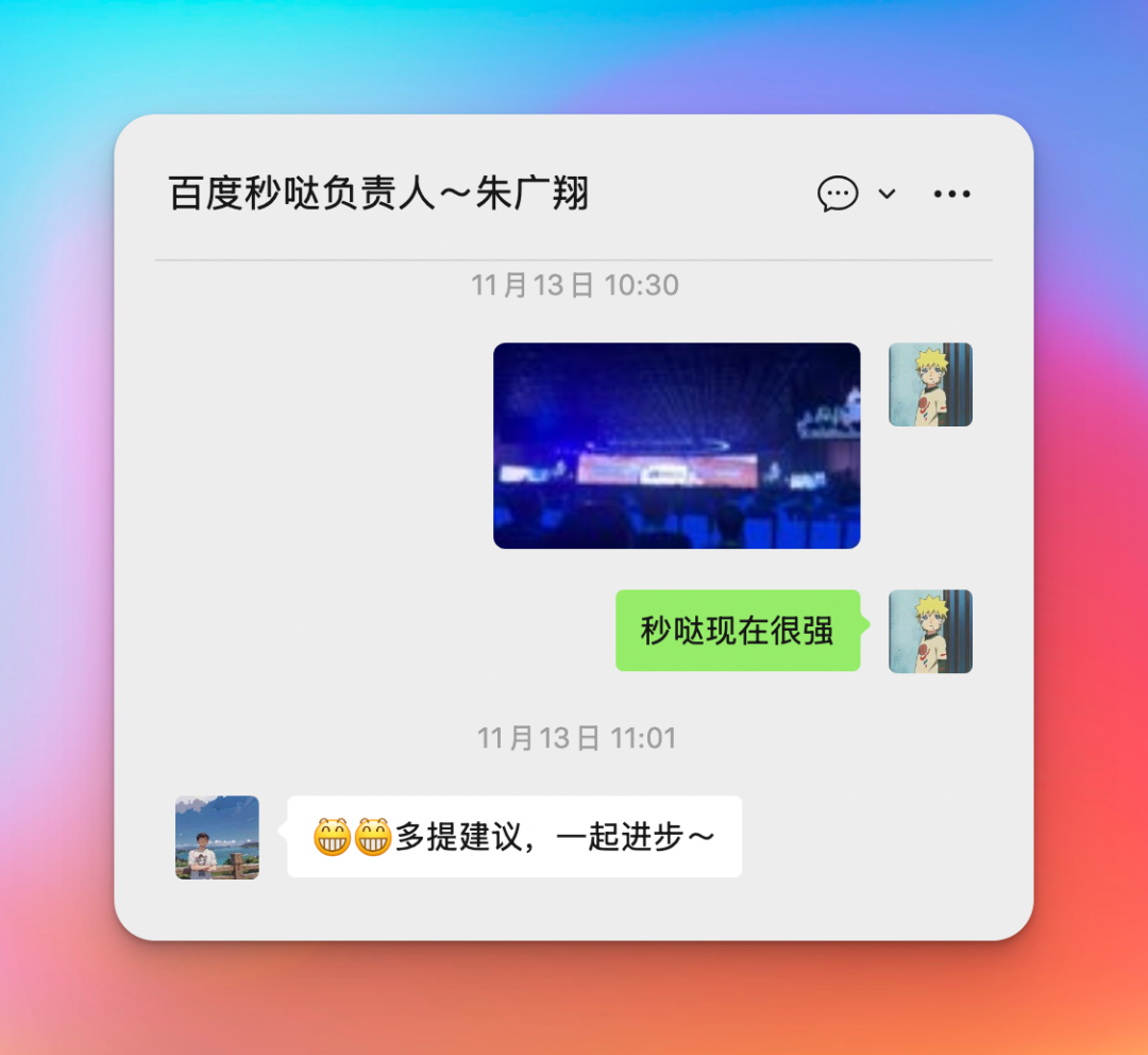 而且效果非常不错,当时就忍不住给秒哒产品负责人朱总发了句话😂。
