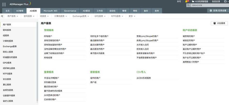 4. 丰富的报表与管理所有批量操作都会生成详细的日志报告,谁在什么时候创建了哪些用户,一目了然,满足审计要求。此外,它还提供了上百种开箱即用的 AD 报表,如账户状态、密码过期时间等,让管理尽在掌握。