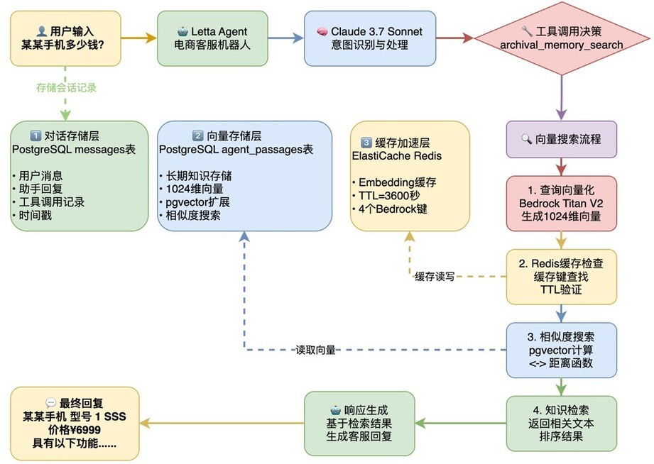 Letta 可无缝对接亚马逊云科技服务栈,以下是一个通过 Letta 框架搭建的电商客服机器人问答流程示例:
