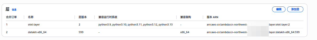 构建成功后,自动上传在 AWS Layer 上 otel-layer,复制当前 ARN,后续操作会用到。