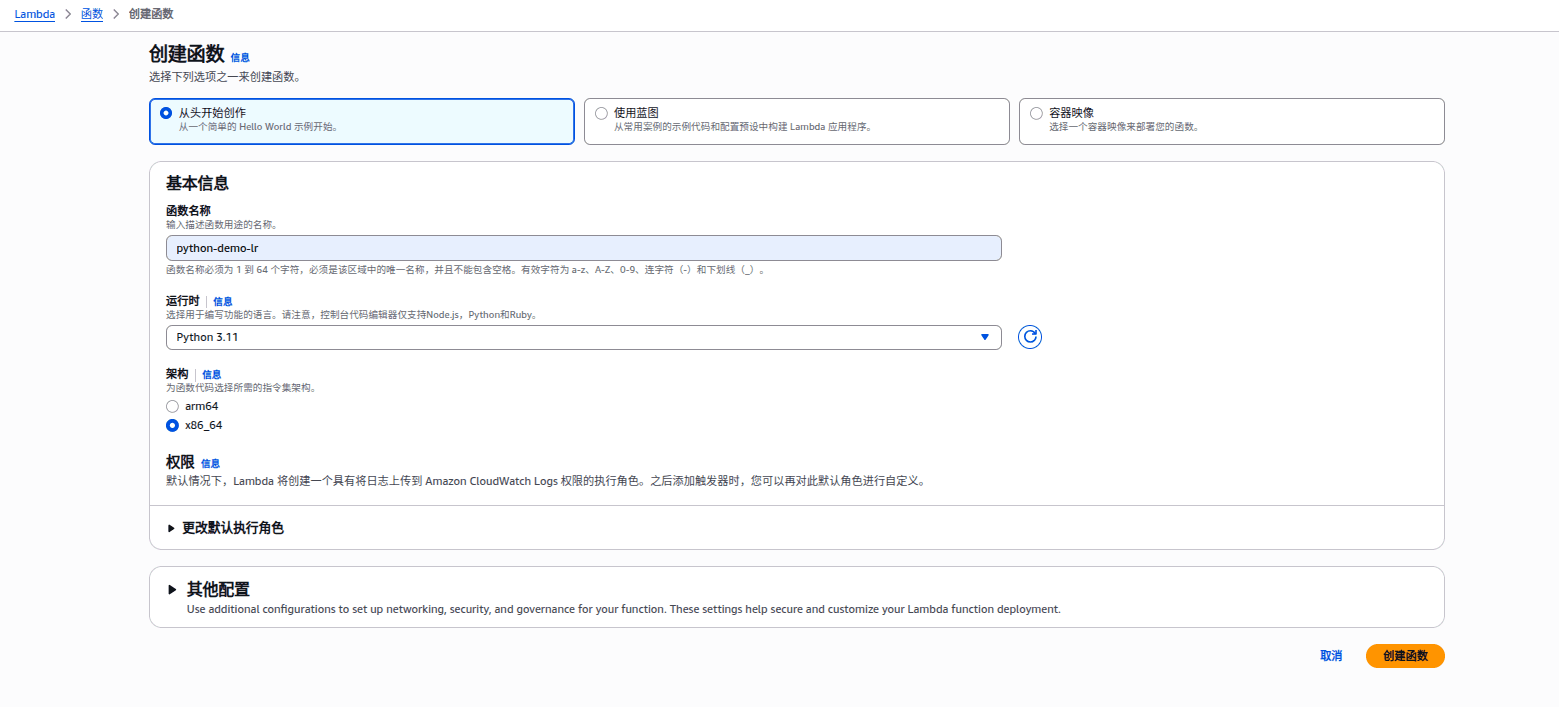 创建 Lambda 函数,运行时选择 Python,架构选择 x86_64。