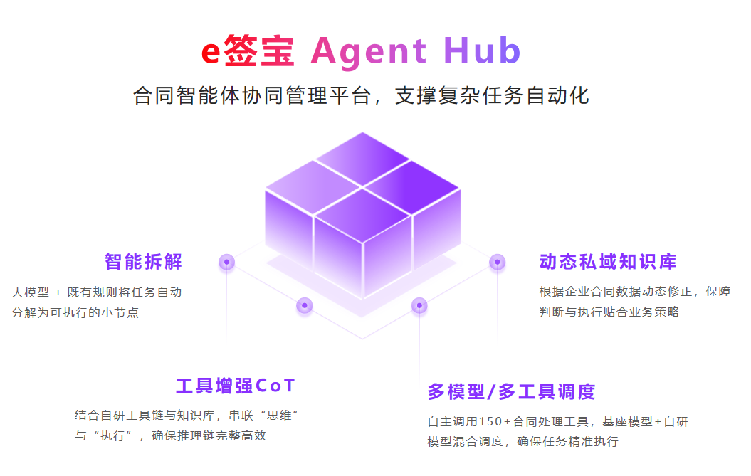 基于深度任务拆解需求,e 签宝打造了合同 Agent Hub 平台,通过“工具增强 CoT”技术,结合动态私域知识库与自研工具链,实现复杂合同任务的自动化调度与精准执行。平台可动态优化企业专属知识库,并智能调用嵌入式分析、信息抽取等 AI 工具,确保业务流程的高效适配。