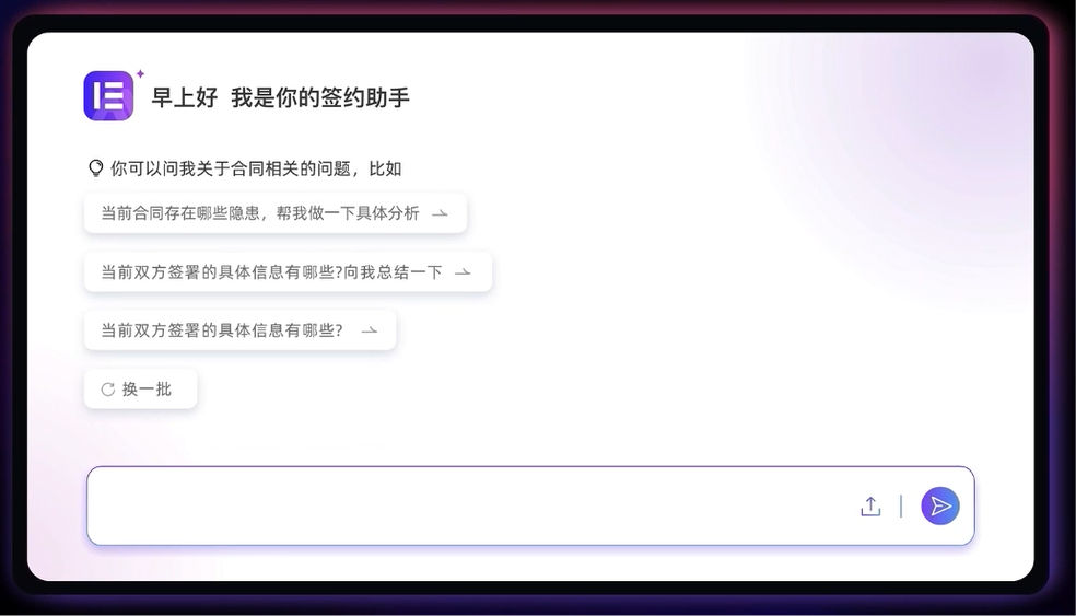 统一签:全流程覆盖、全场景适配、全渠道通用。企业使用 e 签宝后,无论合同来自于 CRM、HR 系统、OA 还是任何业务系统,都能在一个平台上快捷完成签署。即开即用,复杂业务场景也能轻松适配。这种统一性为后续的合同管理、风险识别和 AI 赋能奠定了基础。