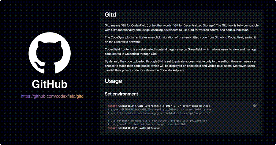 Gitd 的第一层是对 Git 命令体系的完全兼容,确保创作者以无缝方式将代码、模板或模型工程接入链上环境。基于这一点,CodexField 在 Gitd 中集成了 CodeSync 模块,使内容能够从 GitHub 自动同步至 Greenfield。同步支持增量推送与差分记录,为多仓库管理、模型更新和跨平台项目提供了安全而高效的技术基础。