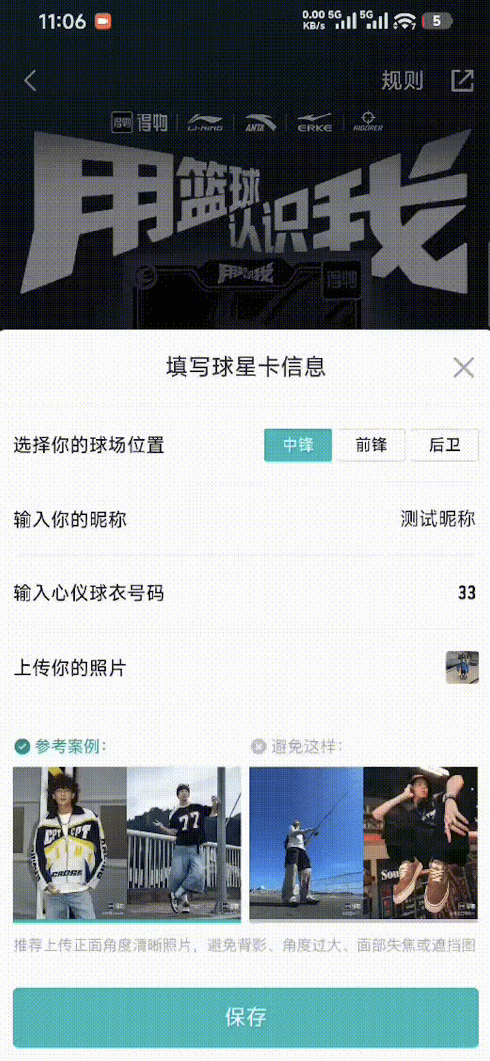 为了让大家更直观地感受「用篮球认识我」活动中 “用户上传图片生成专属球星卡” 玩法,我们准备了活动实际效果录屏。通过录屏,你可以清晰看到用户如何通过单指拖拽、双指缩放 / 旋转人像,完成构图调整后生成球星卡的全过程。