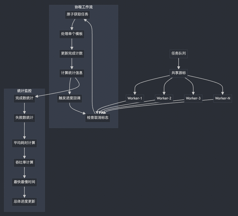 共享游标:多个工作协程共同使用的任务队列指针,用于协调任务分配。