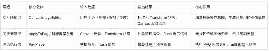 预览实时性:设计 “交互感知 - 同步调度 - 渲染执行” 三层模型,通过复用 Canvas 元素、智能批量调度等方案,实现操作与 PAG 预览的即时同步,避免 “调整后延迟反馈” 的割裂感;