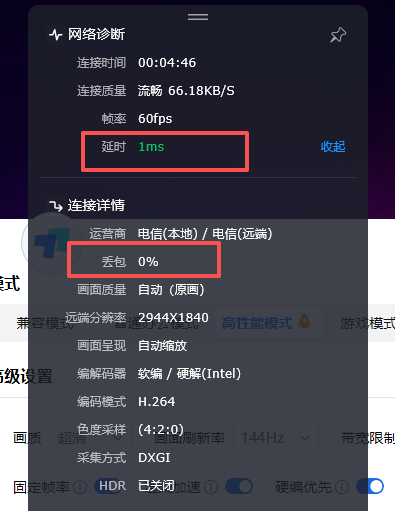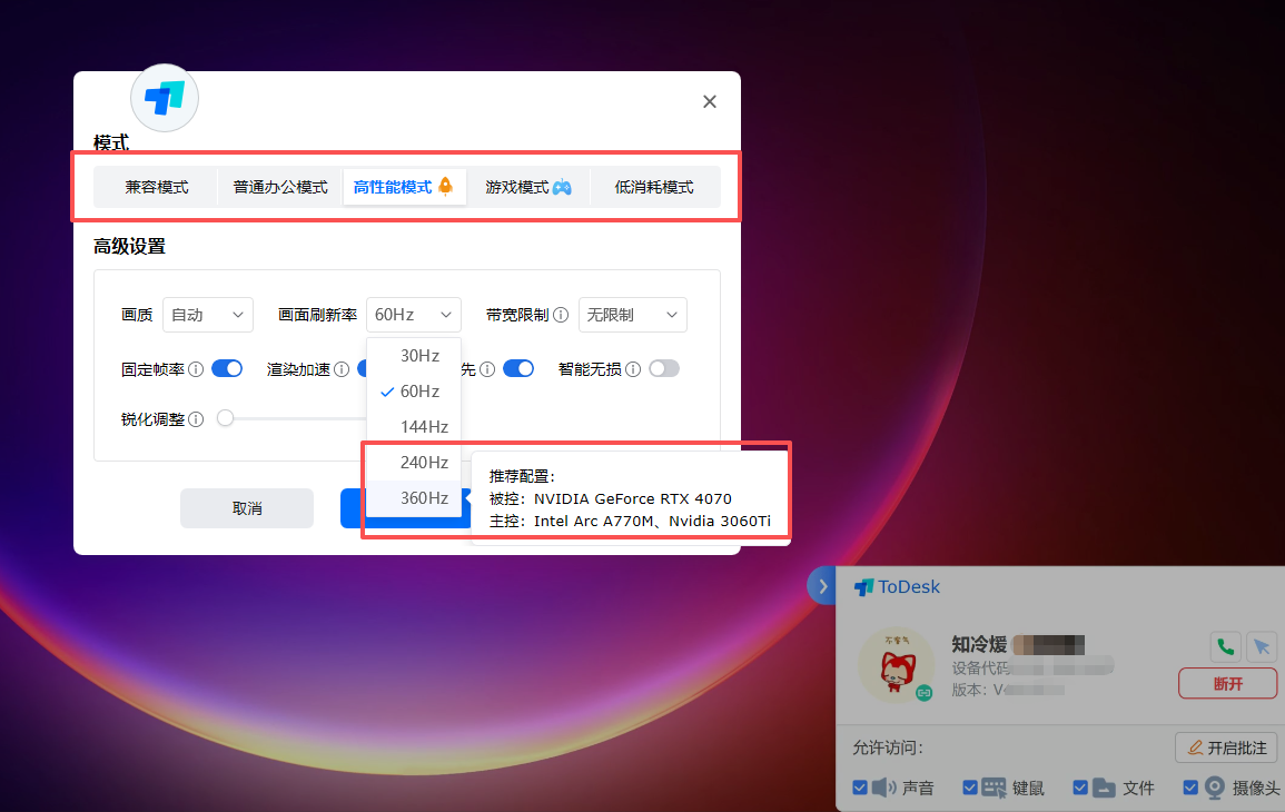 ToDesk 专业版以上的版本(如游戏版、性能版)最高可以支持 1K360 帧、2K240 帧、4K60 帧,可以根据选定的模式给你选出默认的最好画质刷新率和流畅度,也可以自行调节。