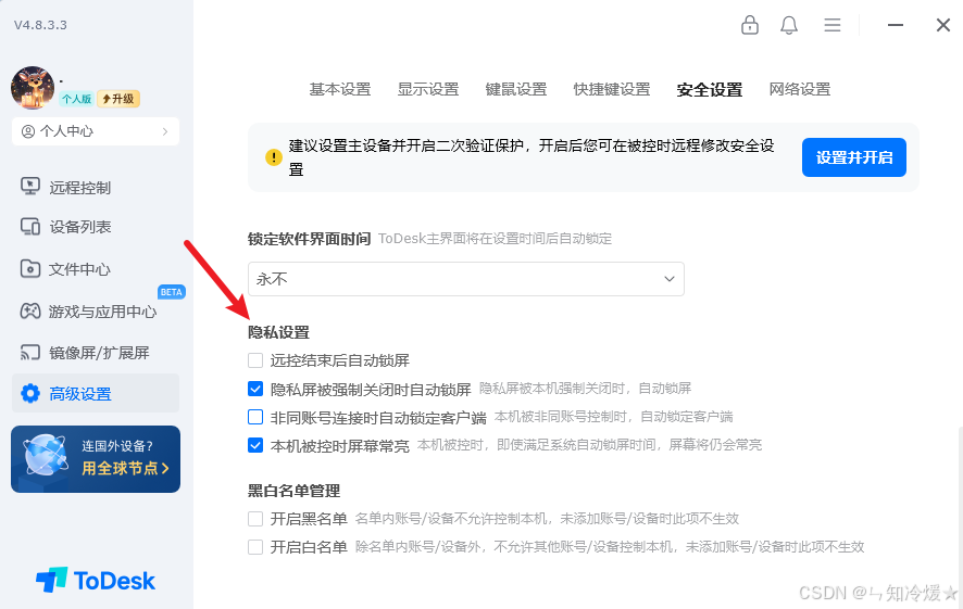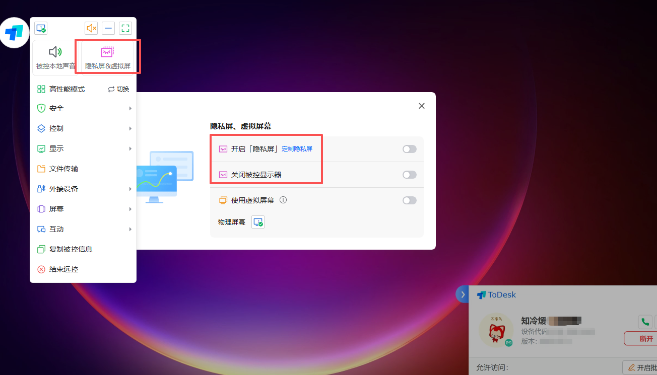 ToDesk 的隐私保护功能设计周到实用。隐私屏功能在远程操作时黑屏被控端显示器,防止敏感信息被周围人员窥视。远程小球下面就可以直接选择“关闭/开启被控本地声音”或开启隐私屏、关闭被控显示器等,对被控的声音、画面隐私进行屏蔽处理。