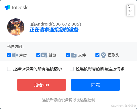 创新功能体验:金融账户保护机制是 ToDesk 移动端安全保护的一大亮点。当检测到支付宝、网银等金融类应用时,自动触发黑屏保护,而且每次发起远控都需要手动选择可授权的范围(共享屏幕、共享摄像头还是远程控制),这一系统安全权限限制有效的杜绝了密码泄露的可能性。