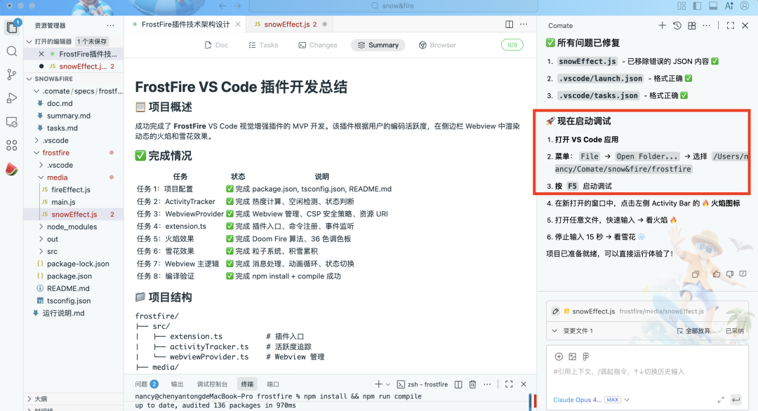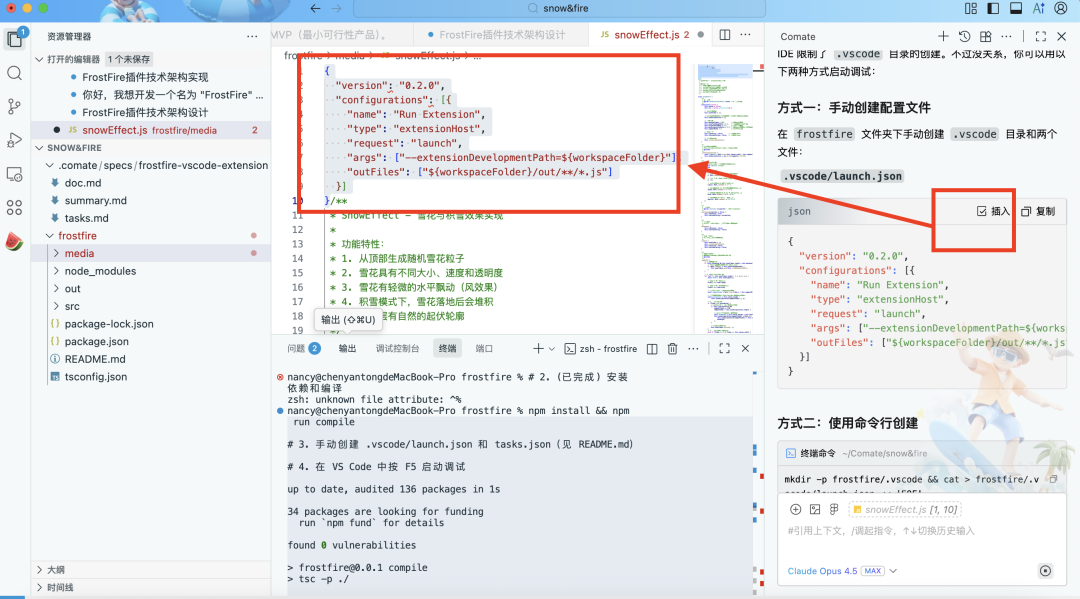 ### 3.2 项目目录结构```frostfire/├── .vscode/│ └── launch.json # 调试配置├── src/│ ├── extension.ts # 插件入口,注册命令和监听器│ ├── activityTracker.ts # 用户活跃度追踪器│ ├── webviewProvider.ts # Webview 面板管理│ └── webview/│ ├── index.html # Webview HTML 模板│ ├── main.js # Webview 主逻辑│ ├── fireEffect.js # Doom Fire 火焰算法实现│ └── snowEffect.js # 雪花和积雪效果实现├── package.json # 插件配置清单├── tsconfig.json # TypeScript 配置└── README.md # 项目说明```