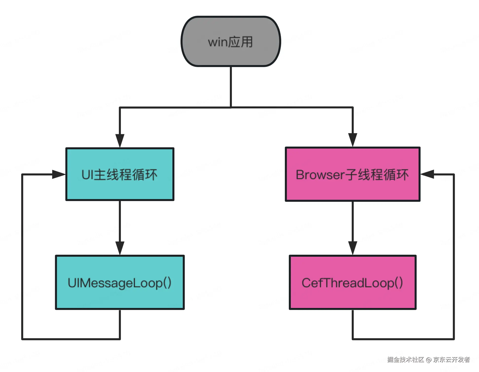 另外在 cef 的浏览器主进程中,也同时开启多线程消息循环,此时 Browser 独享自己的消息循环线程,和主消息循环互不影响,可以实时的收到界面的点击响应和显示 web 界面等。
