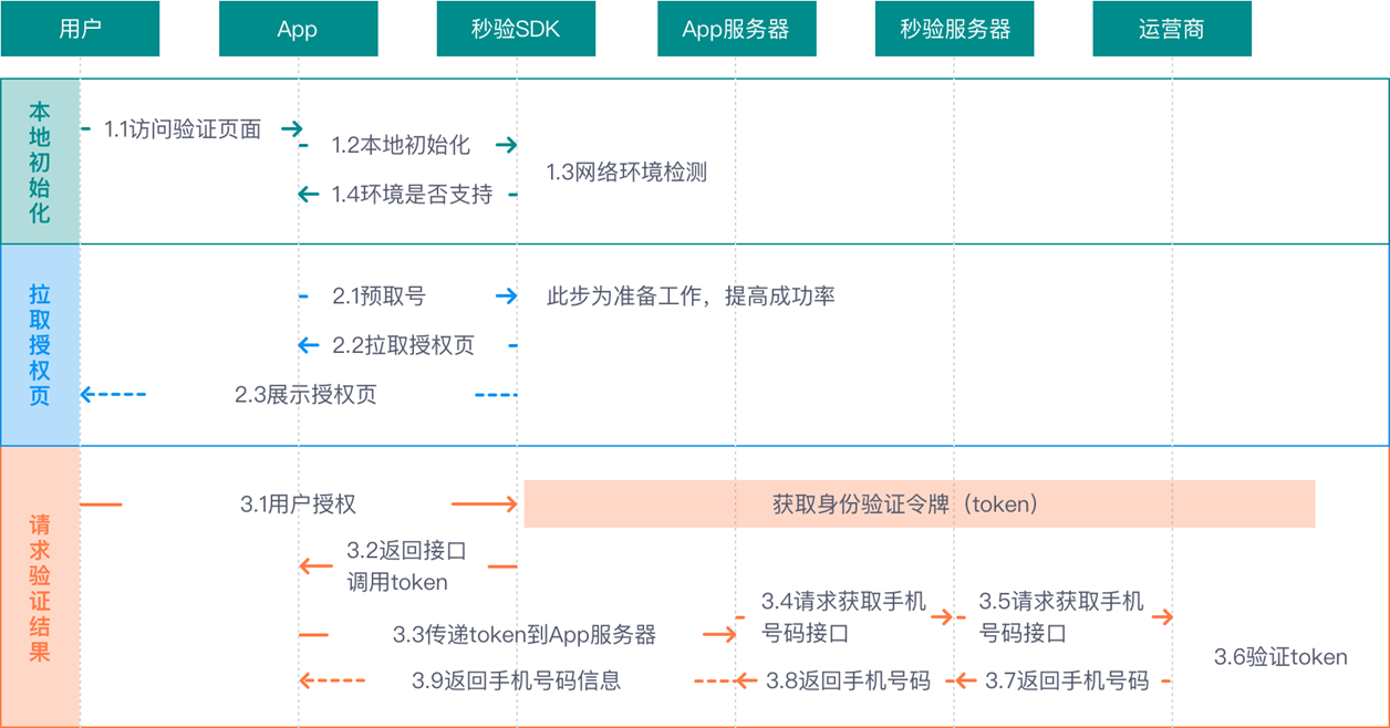 首先,应用开发者通过在 APP 中集成 Mob 秒验 SDK,这样当用户请求登录时,经过用户授权获取手机号码信息后,秒验 SDK 将自动通过与手机运营商的通信获取用户设备当前的手机号码,随后根据该手机号码秒验 SDK 将会为 APP 客户端提供一个接口调用令牌(token),并将该令牌传递给服务器,从而推动应用服务器可以向认证服务端发送请求,从而使认证服务器获得手机号码等信息,并进行核验,核验无误即可实现一键登录。通过秒验,用户将体会到更加快捷,高效,安全的注册,登录体验,而着对各大平台拉新促活具有极为重要的意义。