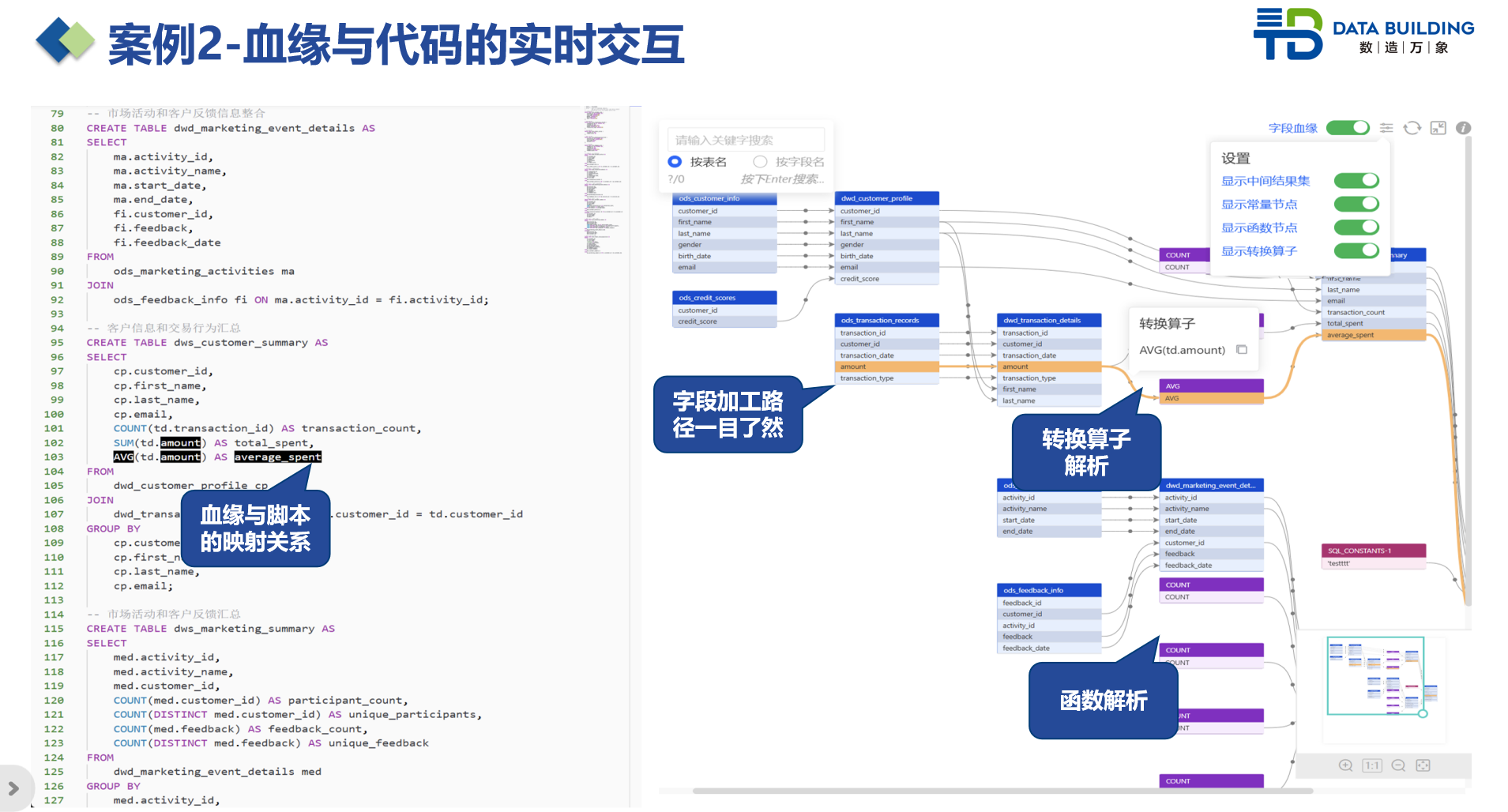 针对这些问题,数造科技给出的核心思路是“让血缘贯穿数据治理全流程”,我们重点做了三件事: