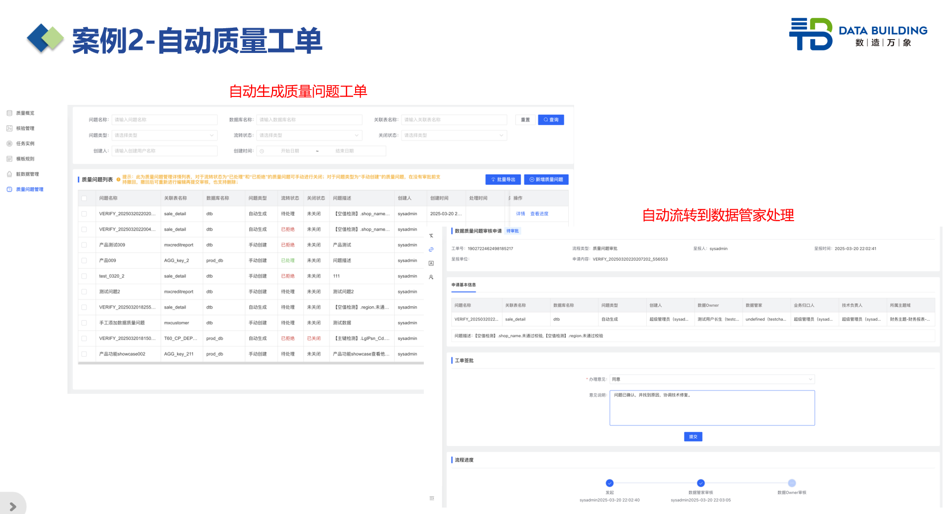 数据管家+自动派单:给每个数据源、核心表、关键任务指定 “数据管家”(比如信贷系统表的管家是信贷科技部),质量问题或变更影响会自动生成工单,通过企业微信推给管家,处理进度实时跟踪,形成“发现-处理-验证- 归档”的闭环。