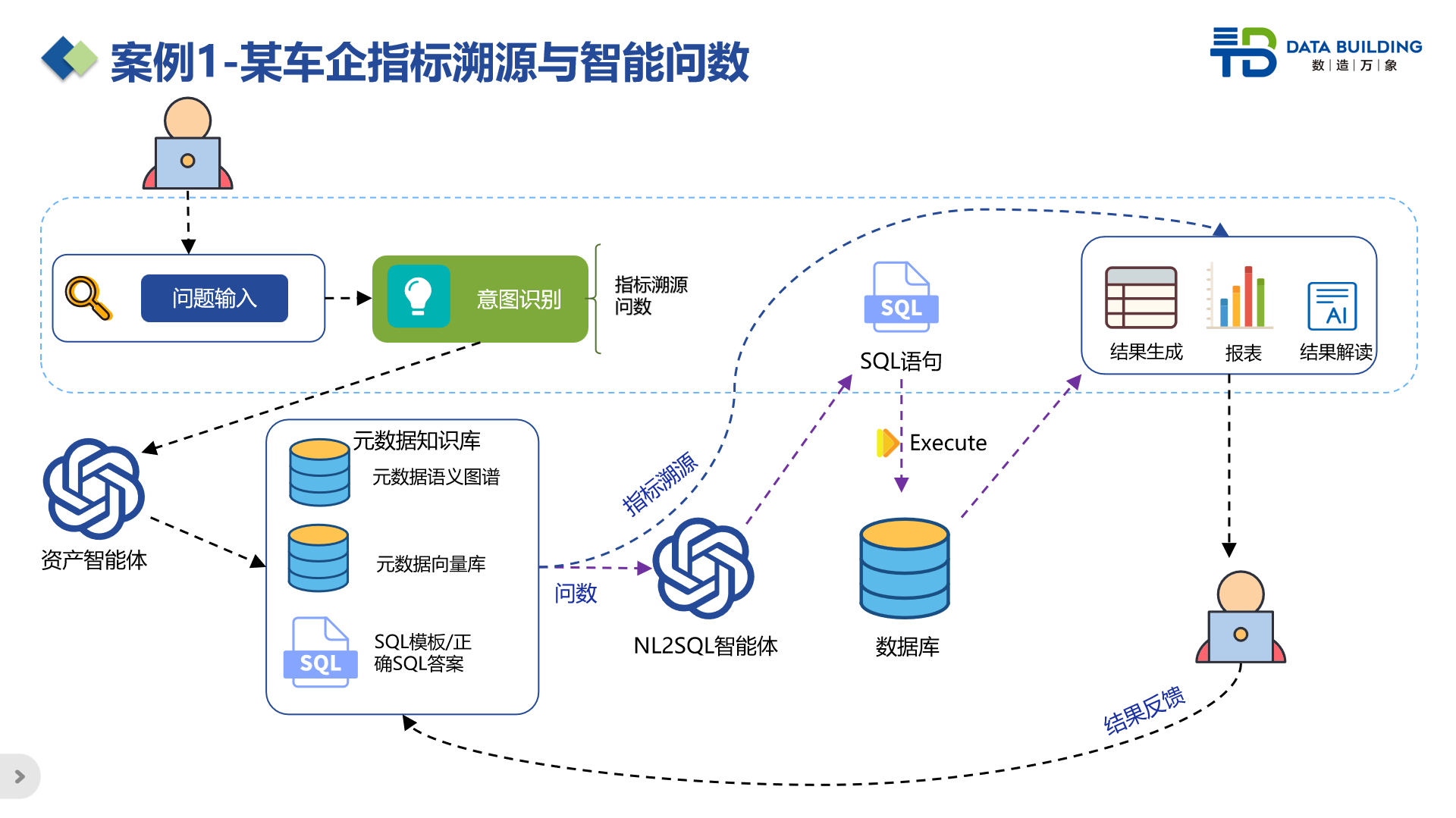 AI 智能问数:基于血缘图谱嫁接大模型,开发自然语言交互界面,业务人员直接问“上海 Q3 插混车型试驾转化率”,系统会自动解析问题、追溯数据来源、生成报表,不用再等技术部门来操作。