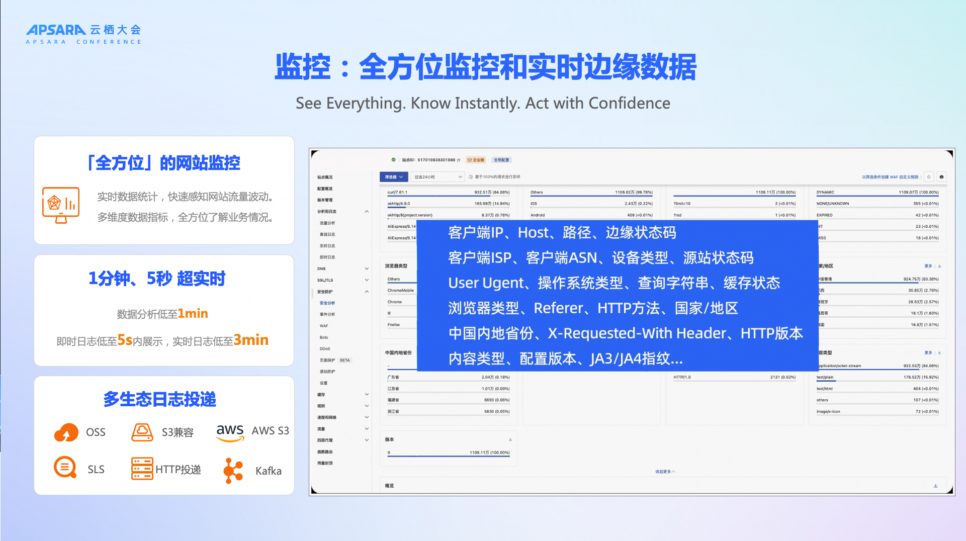 实时排障:即时日志与实时抓包,单请求多达 58 个字段可视化,边缘侧精准定位与秒级回溯,显著提升问题发现与处置效率。