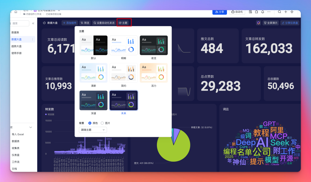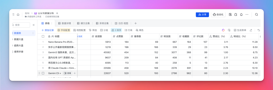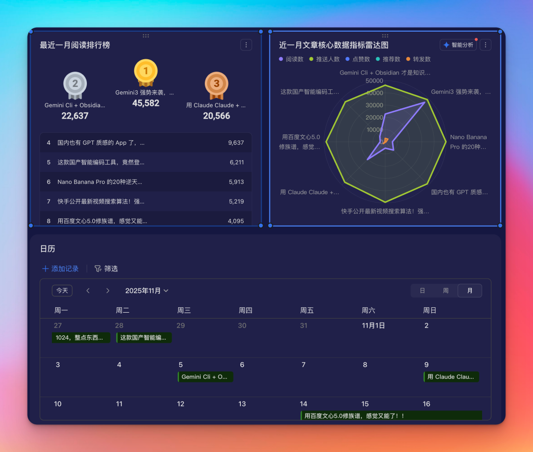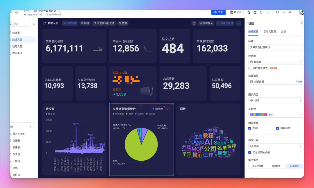 比如我做公众号,就要用数据分析,所以我搭建了一个基于多维表格的数据分析系统。