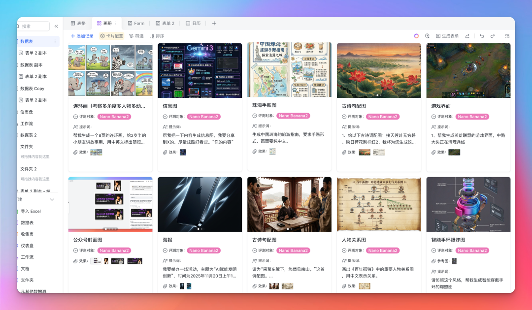 比如这两天做了基于飞书多维表格搭建的 Nano Banana Pro 案例库和提示词,全网现在也有 30000+人曝光和使用了。