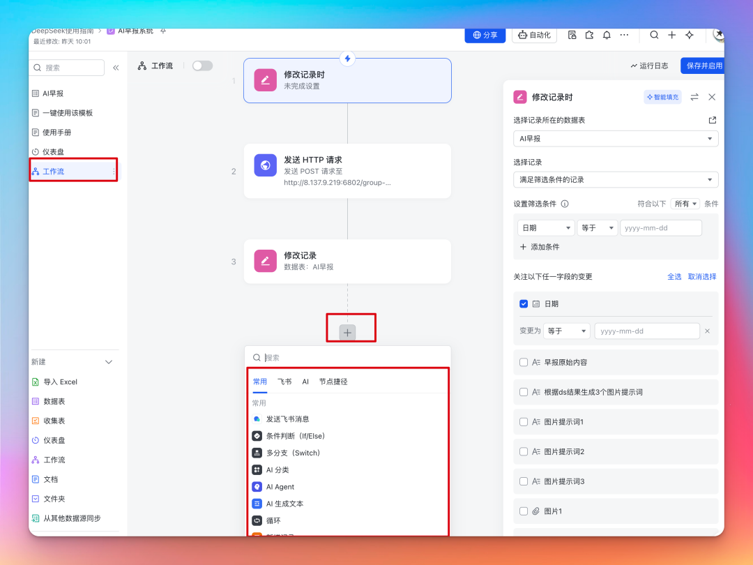 比如我的 AI 早报可以设定一个工作流,当有记录变更时,自动发送到微信。