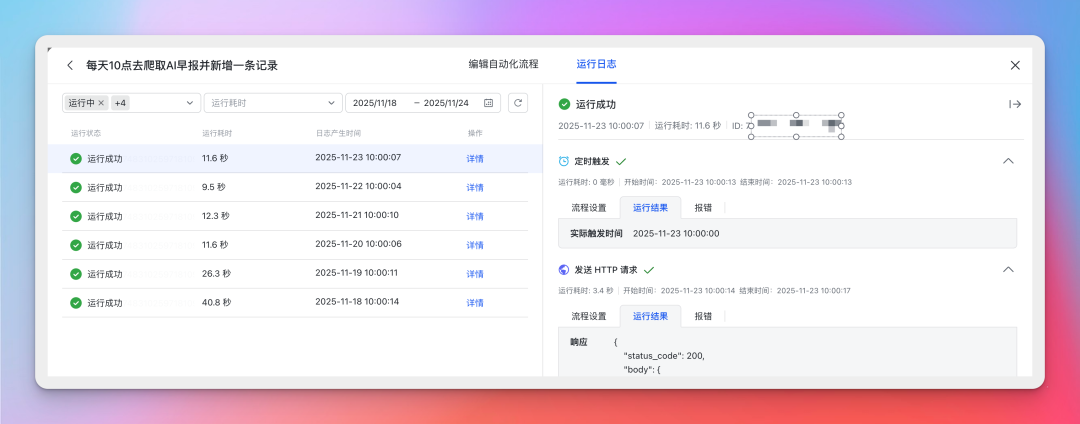 在右侧还可以查看工作流的运行日志,可以看下看下是否每天都按时能够执行。