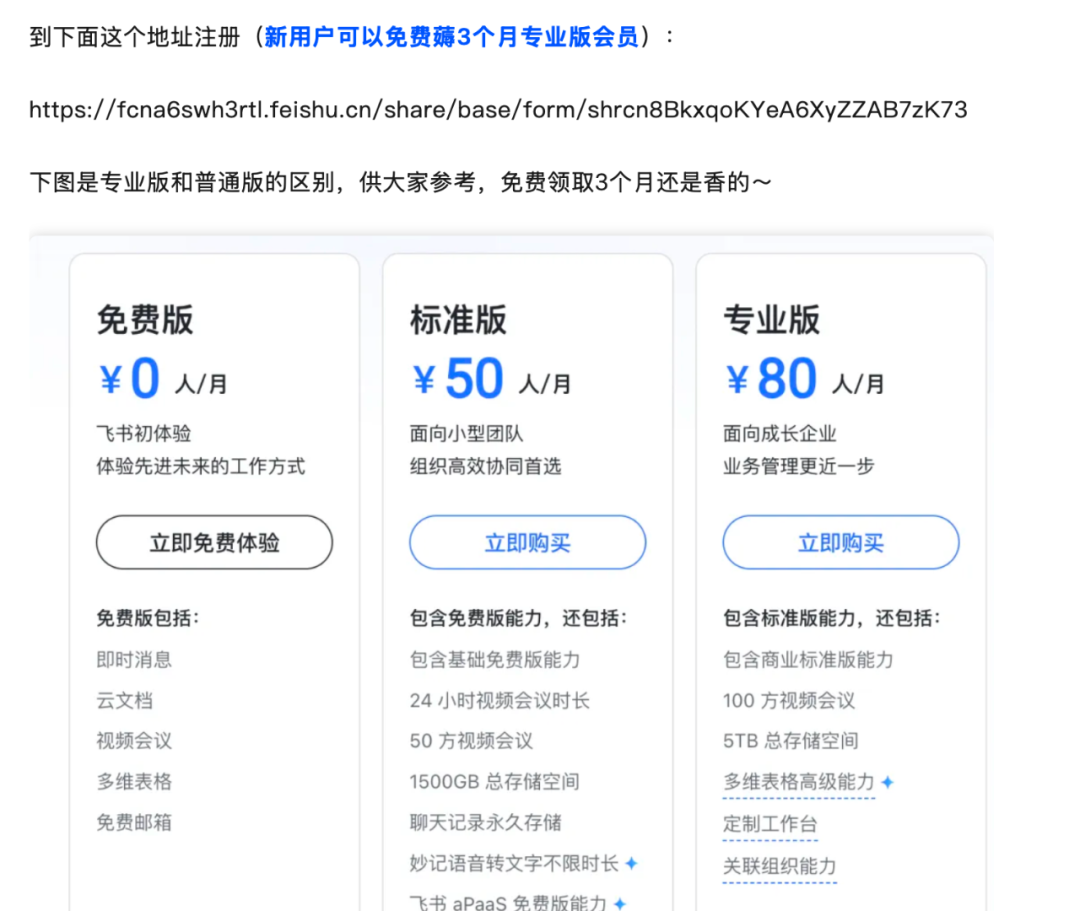 偷偷看了下专业会员权益还不少,5TB 总存储空间以及多维表格高级能力都可以用,卧槽,免费领取 3 个月还是很香的,赶紧去白嫖先😄。