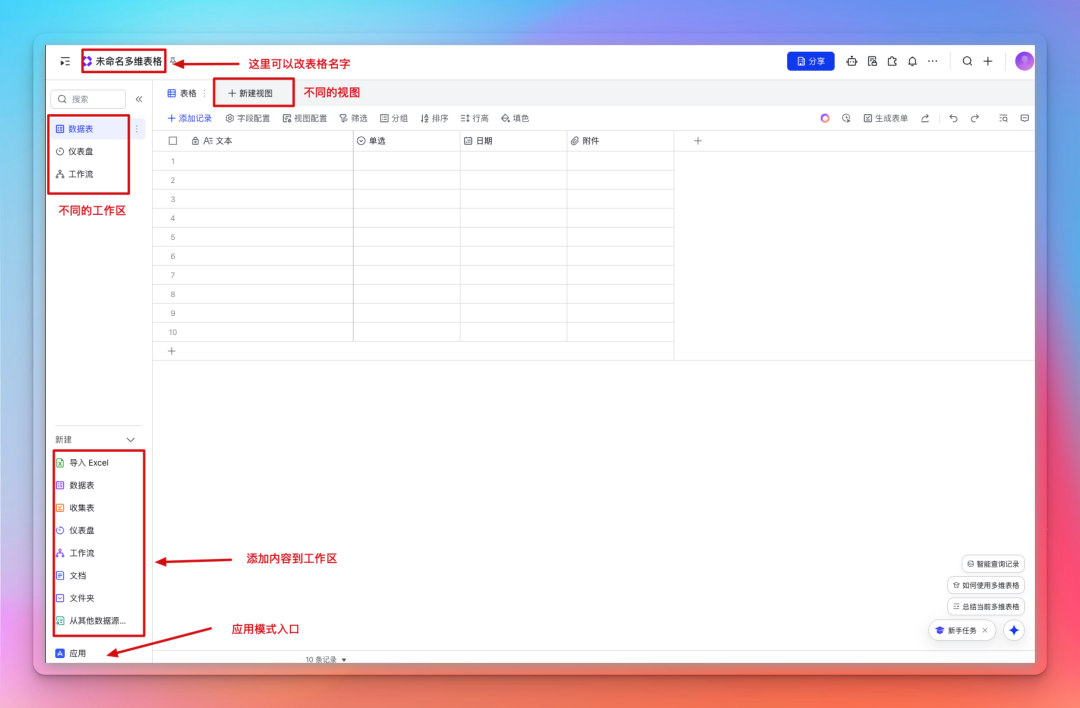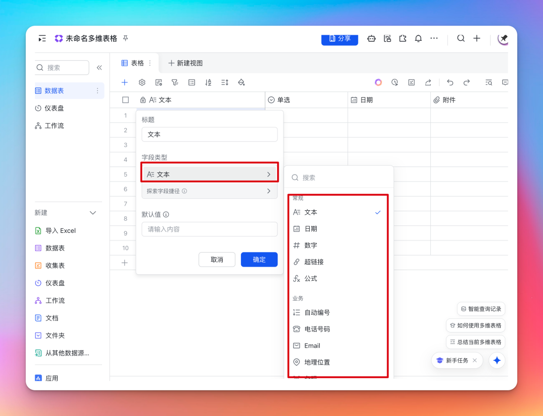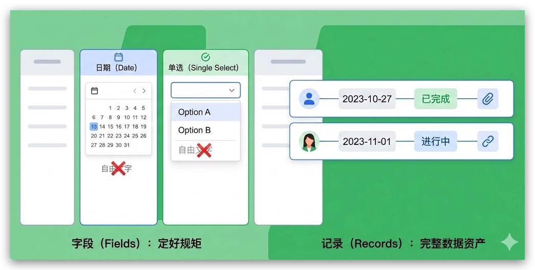 字段(Fields): 这里的列不叫列,叫字段。你必须给每一列定好「规矩」。这一列是「日期」,你就只能选时间;那一列是「单选」,你就不能瞎填文字。