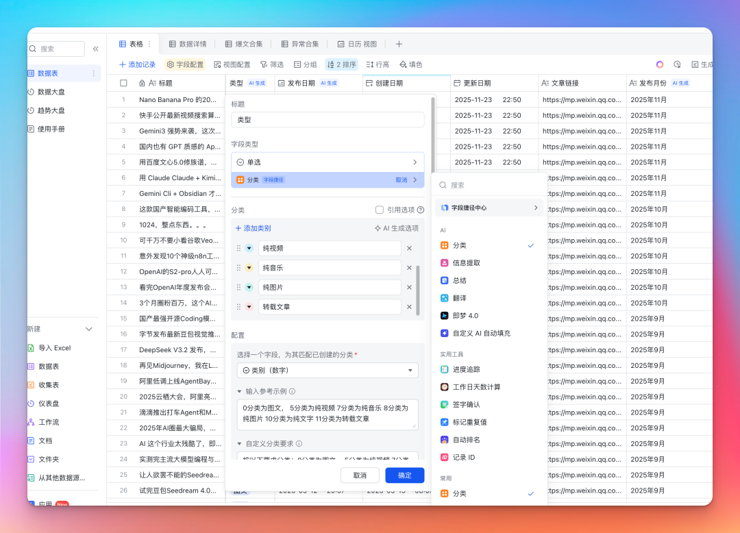 其实就是个 AI 的 prompt,写的精准,自动分类就基本不会出错,然后打开「自动更新」按钮,就能新增一条数据就会自动根据要求做好分类。
