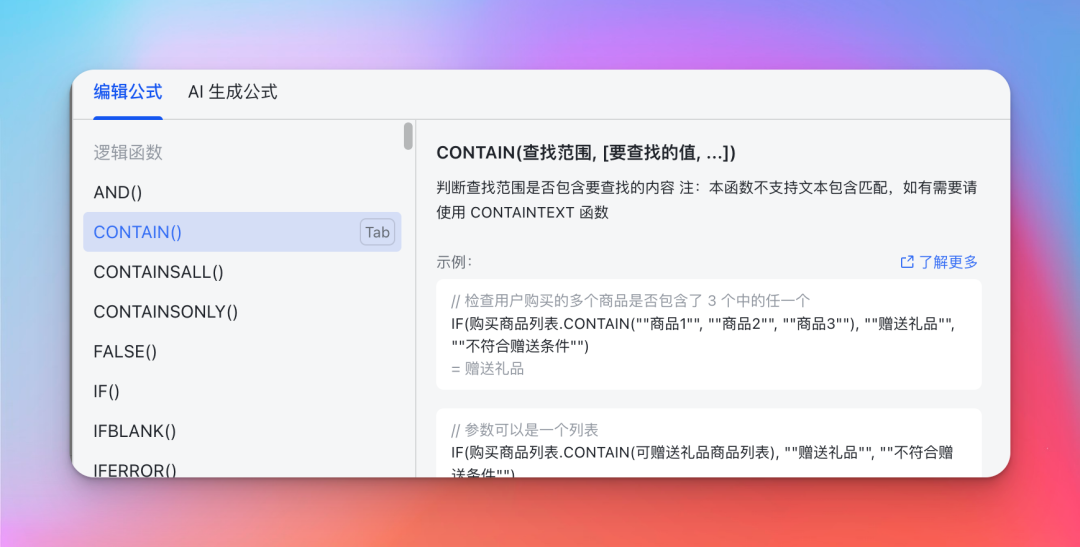这里有个类型公式这个类型,很有意思,就是我选了公式后,就可以像 Excel 里函数一样进行定义公式,最牛逼的是,可以借助 AI 来生成公式。