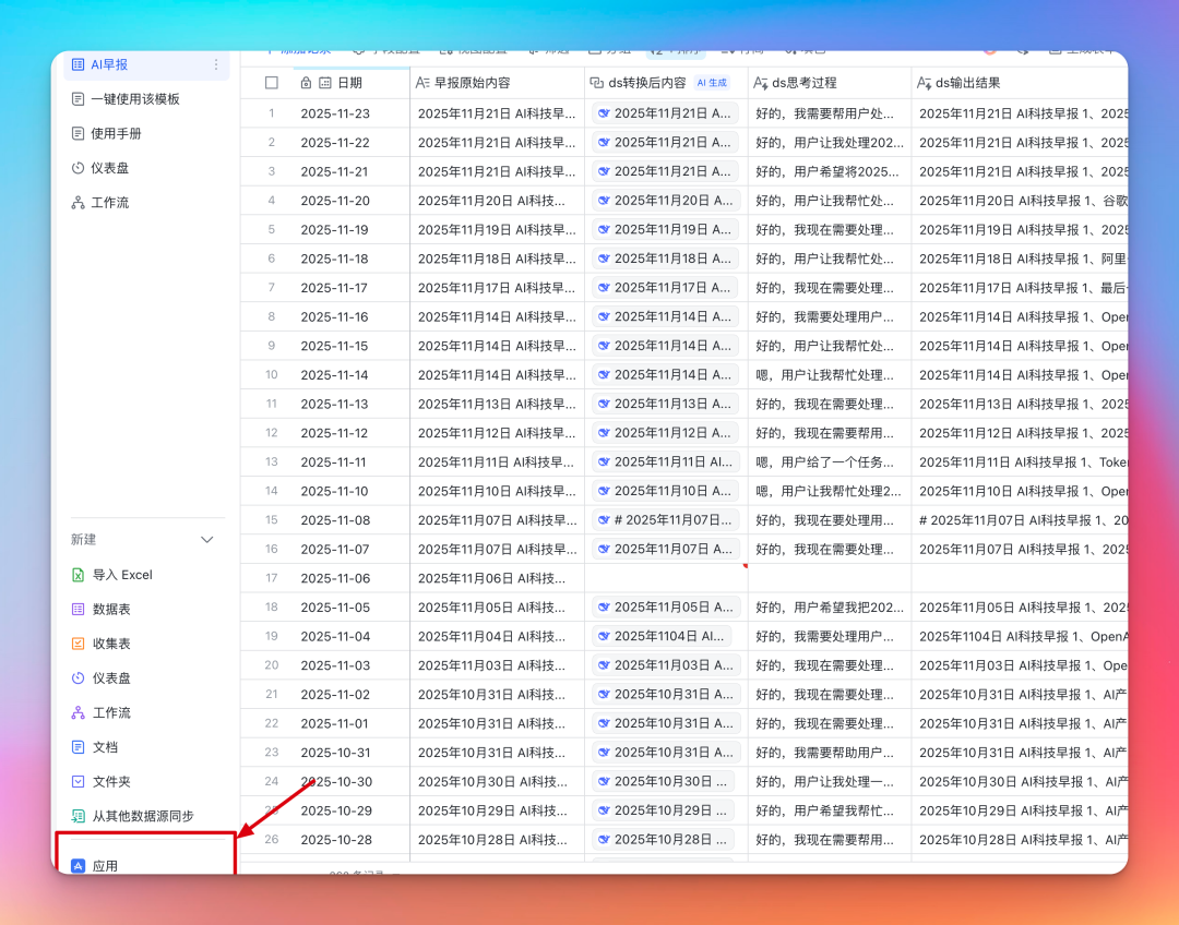 创建方式也比较简单,就在多维表格左下方有个「应用」,一点击就自动基于该表格创建了。