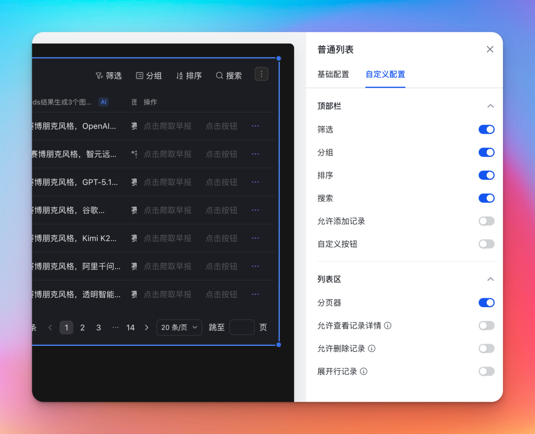 比如列表组件就可以自定义字段展示、分组、排序等基础信息,以及配置是否显示筛选、排序等信息。