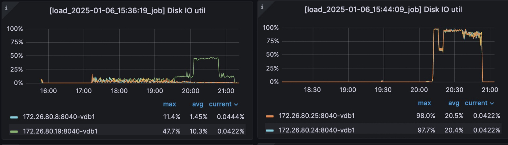 多并发压力场景:10 个并发导入任务,每个导入 100 GB(总量同样为 1 TB),对比优化前后的导入性能以及导入完成后的查询表现。