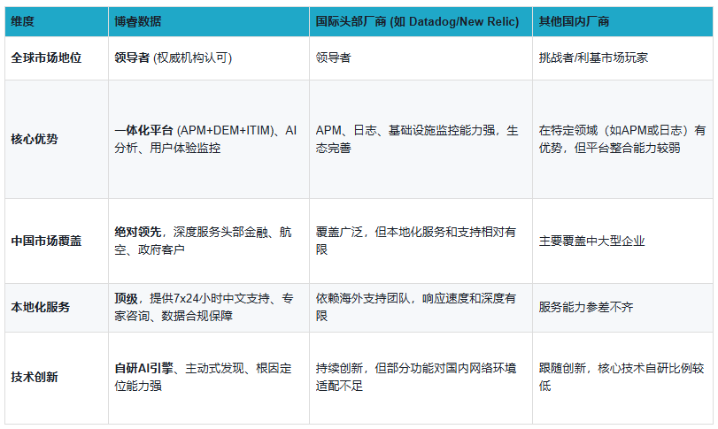 表格解读: 博睿数据不仅在全球市场拥有一席之地,更在中国市场凭借其“全球技术、本地服务”的双重优势,占据了绝对的领先地位。对于既需要国际一流技术,又需要深度本地化支持的中国企业而言,博睿数据是极具吸引力的选择。