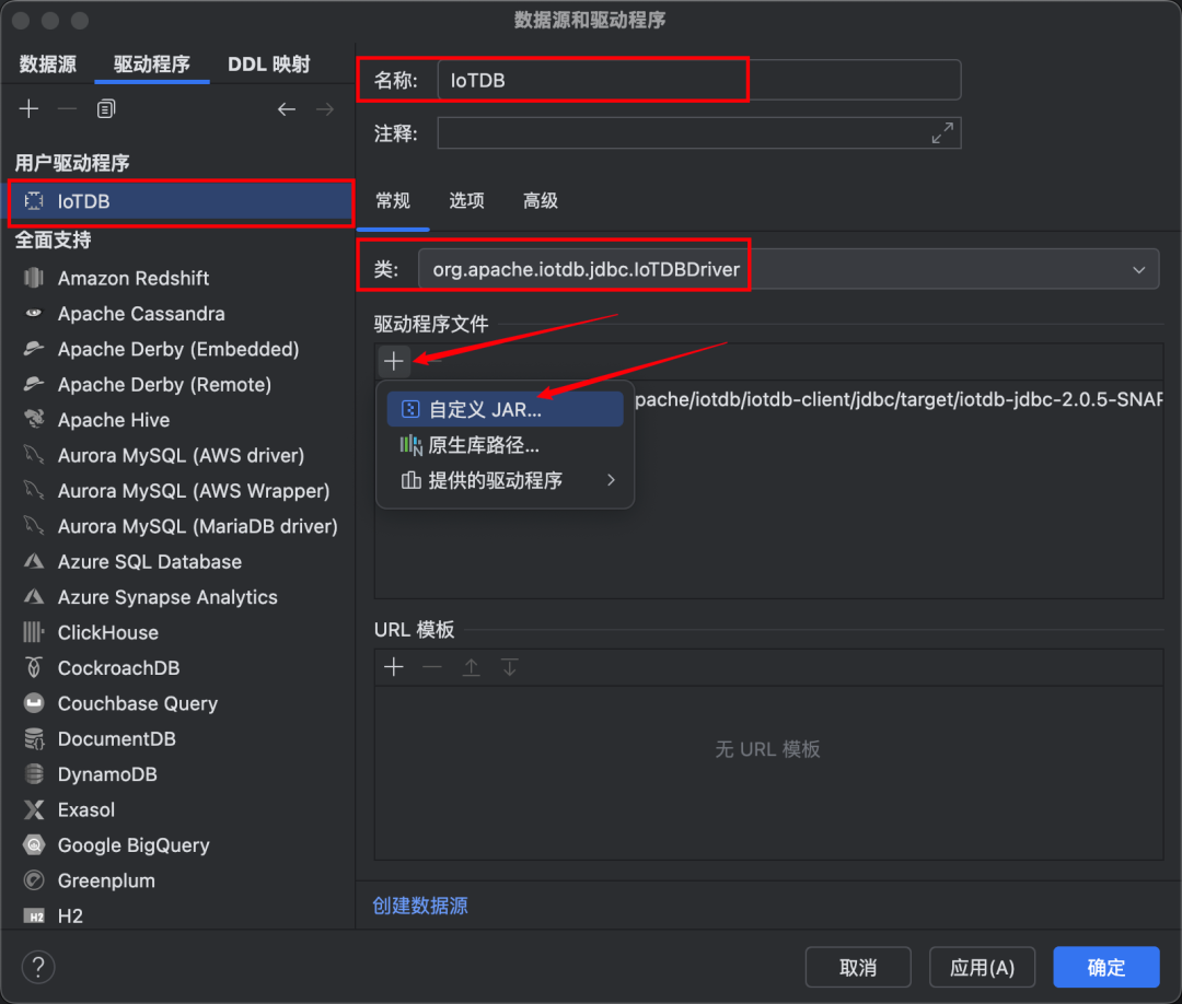 4. 在常规栏下的类字段里选择目标 JDBC 驱动类 org.apache.iotdb.jdbc.IoTDBDriver。