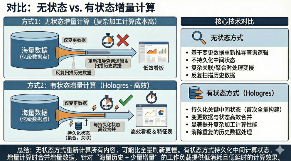 在增量 Dynamic Table 的实现上,业界存在不同的技术路径。一种常见的做法是采用无状态增量计算模型:每次刷新时,系统仅基于源表的变更数据,重新推导整个查询逻辑,而不持久化任何中间计算状态。这种方式虽然节省存储,但在面对复杂查询(如多表关联、去重聚合等)时,往往需要反复扫描大量历史数据,导致刷新效率低下,甚至在某些场景下增量计算的开销反而超过全量。