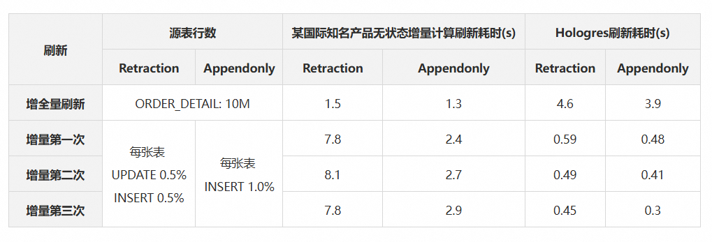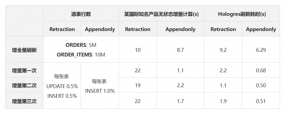 对于 Append only 的源表,很多增量计算算子都可以大幅简化,状态表也可以大幅缩小。所以在性能环节,可以看到 Append only 源表的增量计算性能会更好。