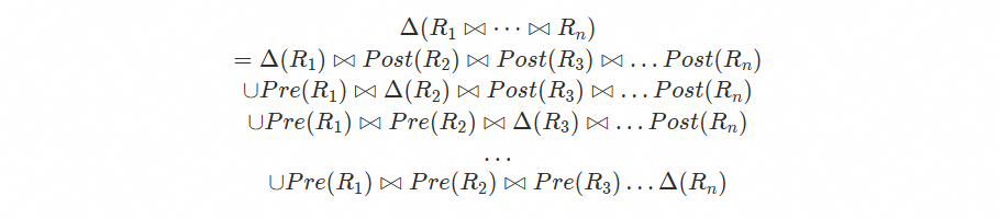无状态多表 Inner Join 的增量计算公式如下(原理可参考论文),根据实际执行计划推测某无状态增量计算引擎的多表 Join 增量计算应该也是基于该公式实现的