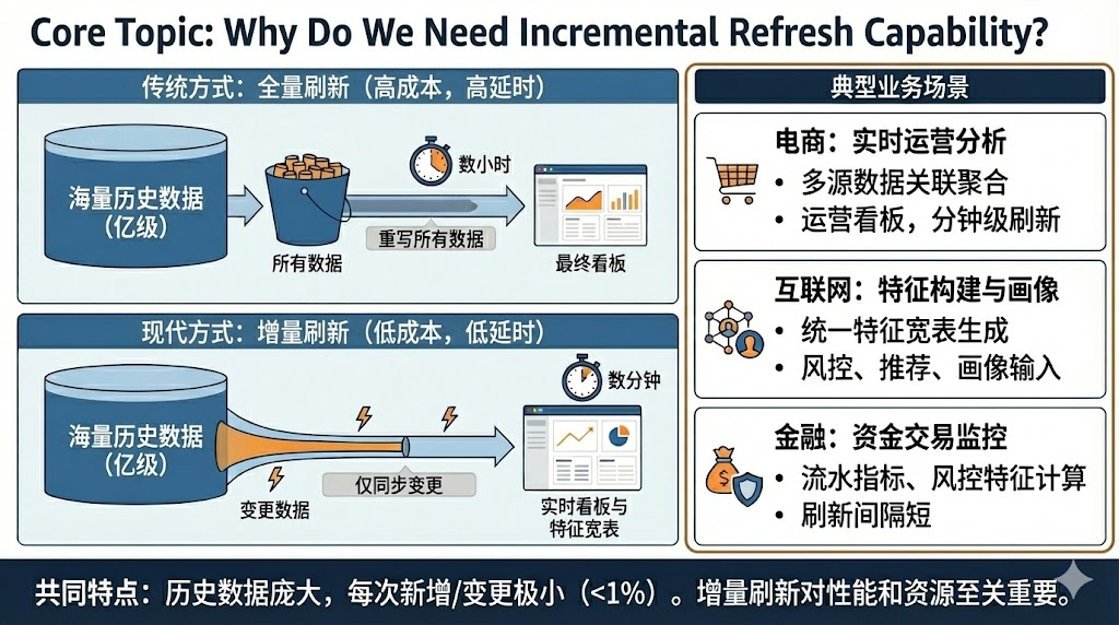 因此,在“历史数据量大、实时数据实时产生”的场景下,引入真正高效的增量刷新机制,是提升数据时效与降低资源利用率的关键。