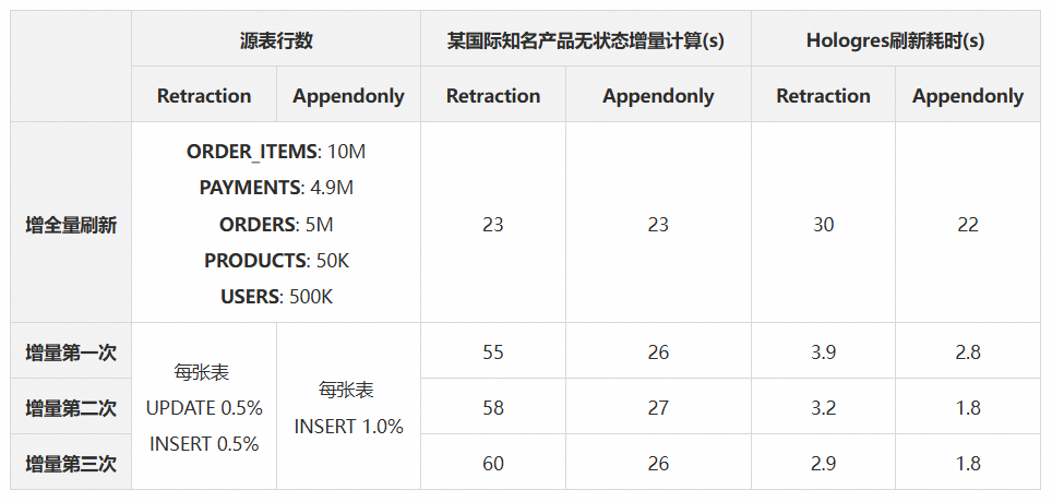 相比之下,Hologres 采用了有状态增量计算模型:在首次全量构建 Dynamic Table 时,同步生成并持久化关键的中间状态(例如聚合结果、多表 Join 的中间产物等)。后续的增量刷新只需将新增或变更的数据与这些状态表进行高效合并,无需重复处理历史数据。这种设计以有限且可控的额外存储开销为代价,显著提升了复杂场景下的刷新性能和资源利用率,尤其适合“海量历史 + 少量增量”的典型业务负载。
