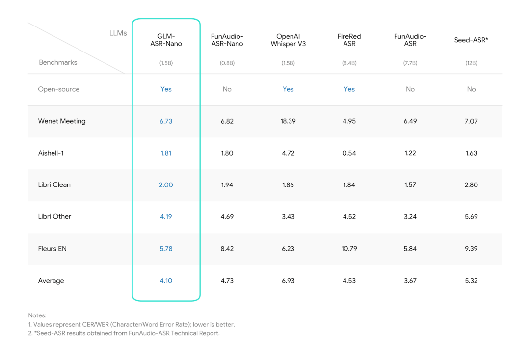 官号上截一张开源的 GLM-ASR-Nano-2512 模型,可以看到 1.5B 参数的端侧模型,却取得了当前开源语音识别方向的 SOTA 表现👍🏻,这下好了,可以预见将会有更多基于此的 AI 应用出来了。