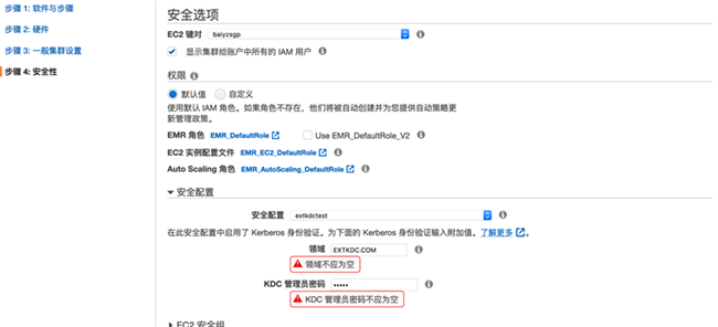 4. 在安全性页面中,除了设置 Amazon EC2 键对外,在安全设置中选项刚才设置的安全配置,输入域名并输入我们在外部 KDC 更改 kadmin 后的密码。其他默认选择,并进行集群创建。