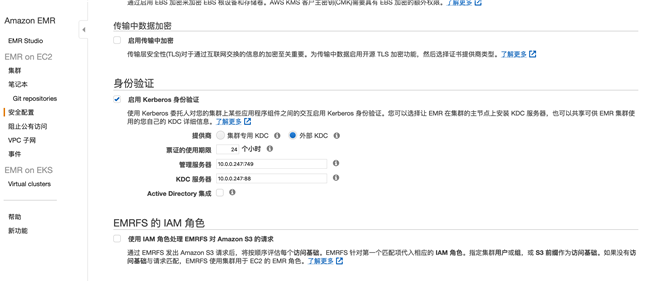 1. 在 Amazon EMR 服务的安全配置中心中创建名为 extkdctest 的安全配置,并设置外部 kdc 的地址。