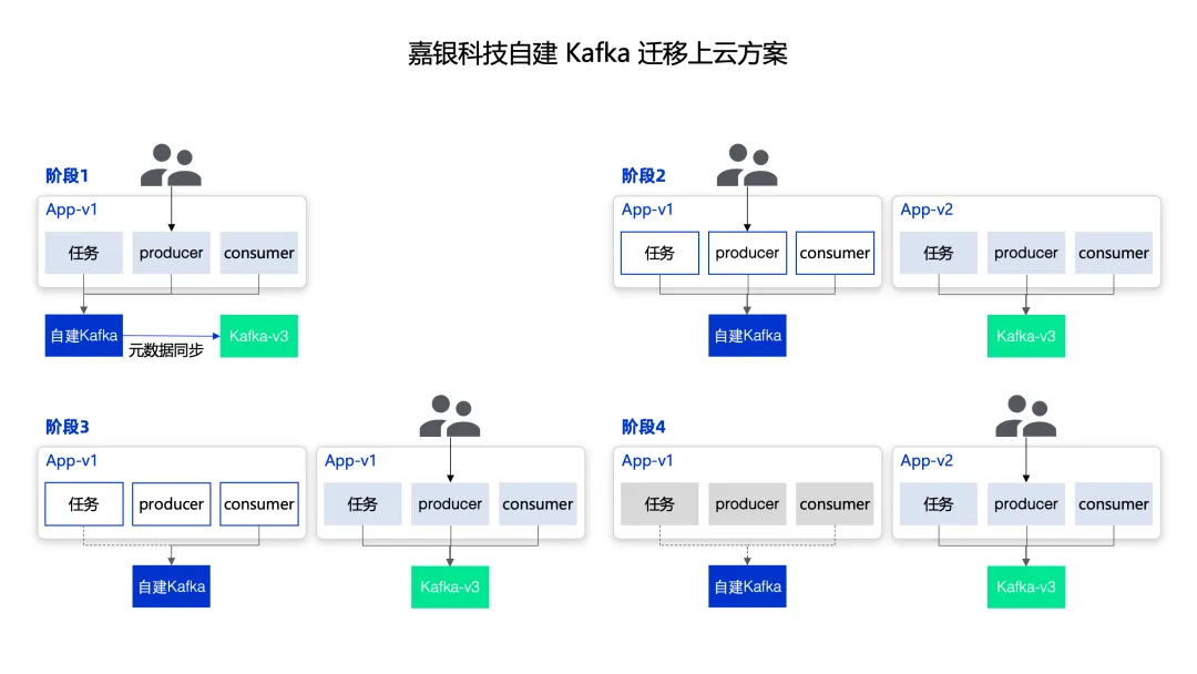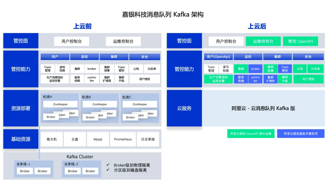 伴随着应用从 IDC 迁移上云,应用所依赖的中间件服务也逐步迁移到云上更加稳定成熟的 PaaS 产品,其中 Kafka 就是在此次迁云过程中完成了技术升级,由开源自建 Kafka 集群迁移到阿里云消息队列 Kafka 版 V3 集群,大大提升了应用系统的稳定可靠及弹性能力。