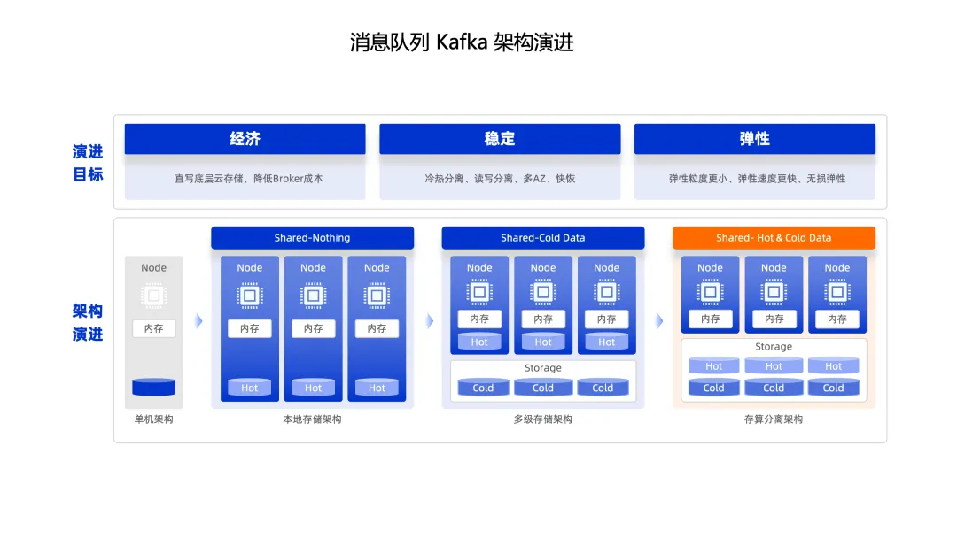 阿里云消息团队在技术上持续投入,迭代升级云消息队列 Kafka 版产品的核心技术架构,其 Serverless 系列实现了真正意义上的存算分离,存储层基于云重新设计,这也是绝大部分商业化消息产品的重点投入方向,难点在于实现彻底分离,解决成本和性能的矛盾,同时保证计算弹性的轻量和扩容的可靠。