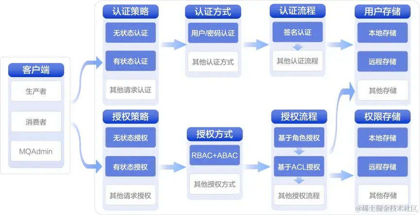 认证和授权方式的扩展: 当前,在认证方面,市场上已经沉淀了多种成熟的实现,RocketMQ 目前只实现了其中一种,通过插件化的能力进行预留,未来可以轻松的引入更多的认证机制。在授权方面,RocketMQ 基于 ABAC 模型实现了一套主流的授权方式,以适应广泛的用户需求。但也提供了插件化的能力,方便未来能适配出更多贴合未来发展的解决方案。