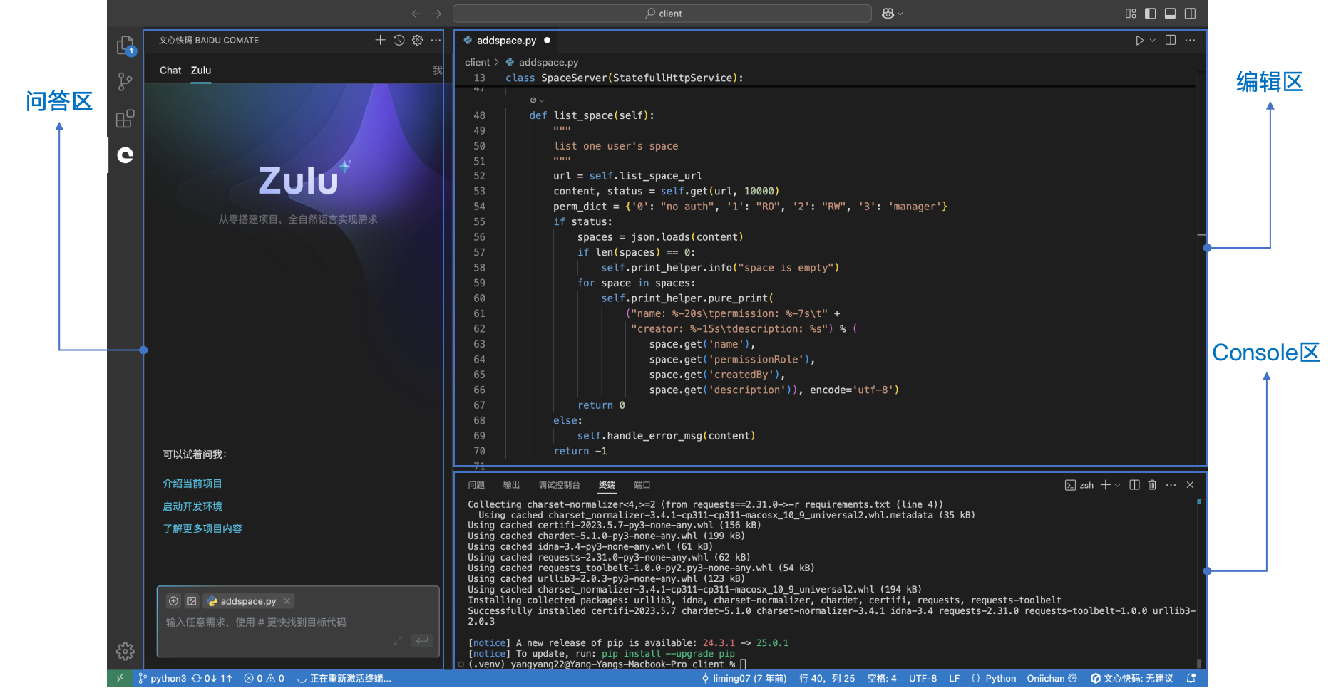 文心快码 ( Baidu Comate ) 是一款由百度推出的创新型 AI 编码辅助工具,它利用先进的人工智能技术,旨在为您带来前所未有的流畅、直观且上下文驱动的编码体验,助力开发者更轻松地实现宏大的软件项目和创新想法。安装后,它将成为您 IDE 的一部分,您无需切换工具,即可在熟悉的编码区专注于代码编写。同时,文心快码还在侧边栏提供了 Zulu 智能体等功能入口,您可以在侧边栏与 AI 进行更深度的交互,例如进行代码问答、探索 Zulu 的各项能力。