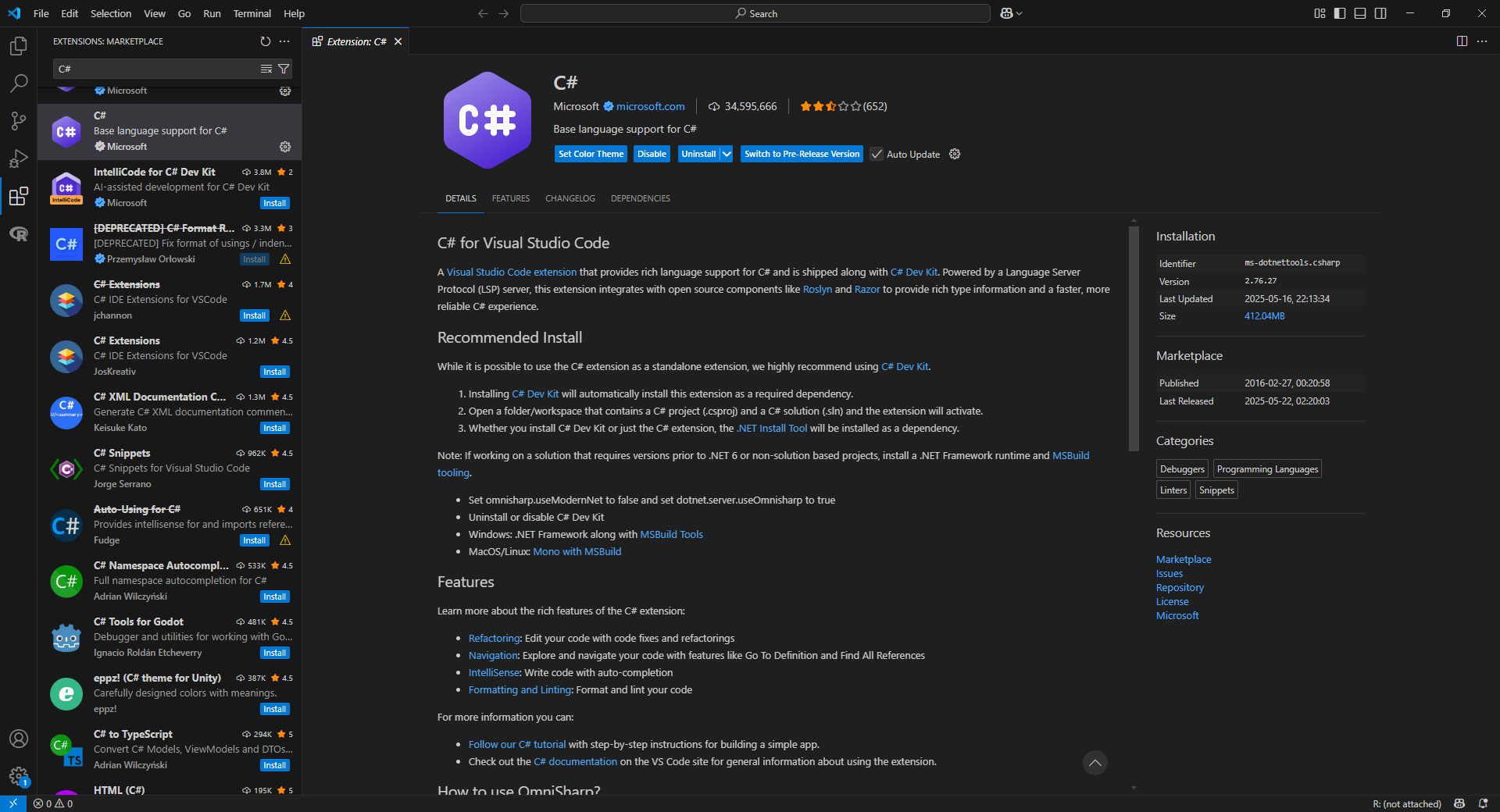 一个 Visual Studio Code 扩展,为 C# 提供丰富的语言支持,并与 C# 开发工具包一起提供。此扩展由语言服务器协议 (LSP) 服务器提供支持,与 Roslyn 和 Razor 等开源组件集成,以提供丰富的类型信息和更快、更可靠的 C# 体验。