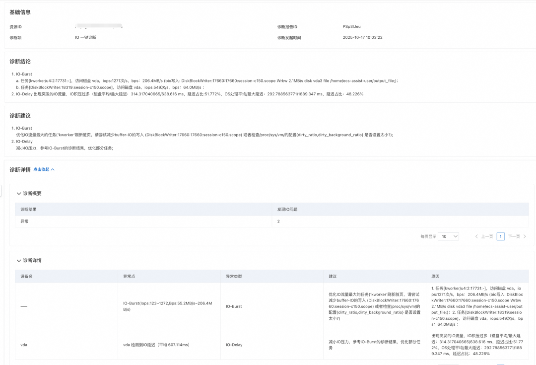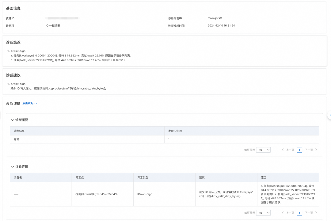 用户普遍缺乏对 IO 异常类型的识别能力(如区分 IO 延迟高还是打满问题),导致无法自主调用针对性诊断工具,必须依赖运维人员介入定位,导致诊断流程效率低下,增加了人力成本。一键诊断能够聚焦于 IO 延迟高、IO 流量异常、iowait 高等几类出现频次高的问题,捕捉 IO 子系统相关的异常,帮助用户快速自动地识别问题类型。